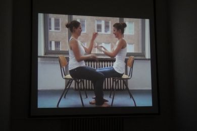 In dem Ausstellungsraum war eine Leinwand aufgebaut, auf der ein zwanzig minütiger Film gezeigt wurde. "Uffta Uffta - Familie Müllers Klangvariationen" ist der Name von der Arbeit der beiden Studentinnen Damaris Schmidetzki und Maria Wende. Sie saßen sich gegenüber auf zwei Stühlen und begannen dann ein Klatschspiel, so wie ich es einst aus meiner Grundschulzeit noch kannte. Erst dachte ich das Video sei geschnitten worden, jedoch war dies nicht der Fall und die beiden bewiesen ein großes Durchhaltevermögen, das Klatschspiel zwanzig Minuten durch zu halten. Zwischendurch kamen sie ins Schmunzeln oder aus dem Takt, fingen sich jedoch schnell wieder ein und klatschten weiter ;)