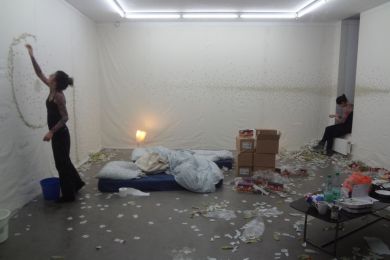 Lustig war es anschließend die beiden bei ihrem Masterprojekt "Kaugummi" zu beobachten. Ich konnte den beiden durch ein großes Fenster dabei zu sehen, wie sie ein Kaugummi nach dem anderen ankauten und es dann an die Wände klebten. Auch ihre Schlafgemächer befanden sich mit in dem Raum.Von Montag bis Freitag ging die Ausstellung und die Kunst an den Wänden und auf ihrer Haut nahm rasch zu.